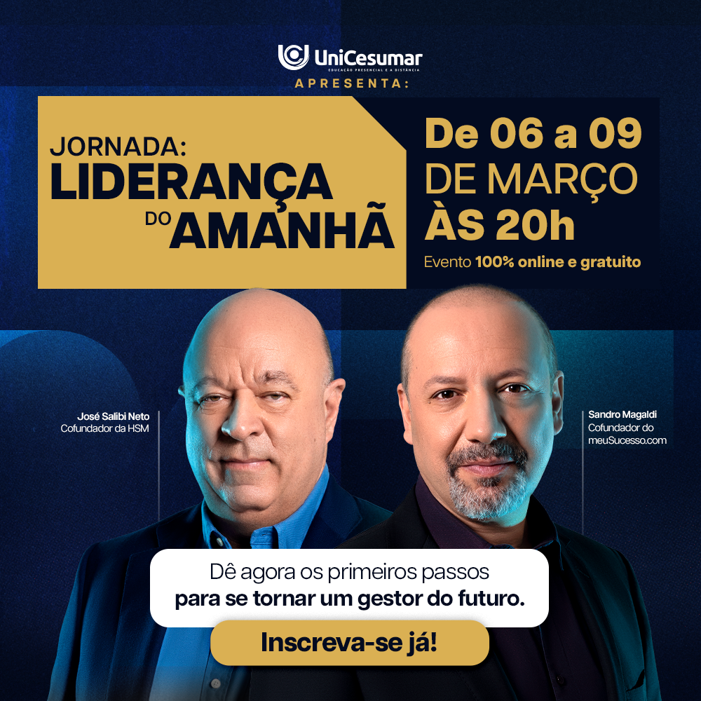 Chegou a hora de abrir novas perspectivas na sua carreira por meio da inovação. Participe da Jornada Liderança do Amanhã. 🚀Serão 4 dias de imersão em conteúdos exclusivos para você aprofundar seu conhecimento sobre gestão estratégica com dois dos maiores experts da área no Brasil: José Salibi Neto e Sandro Magaldi.